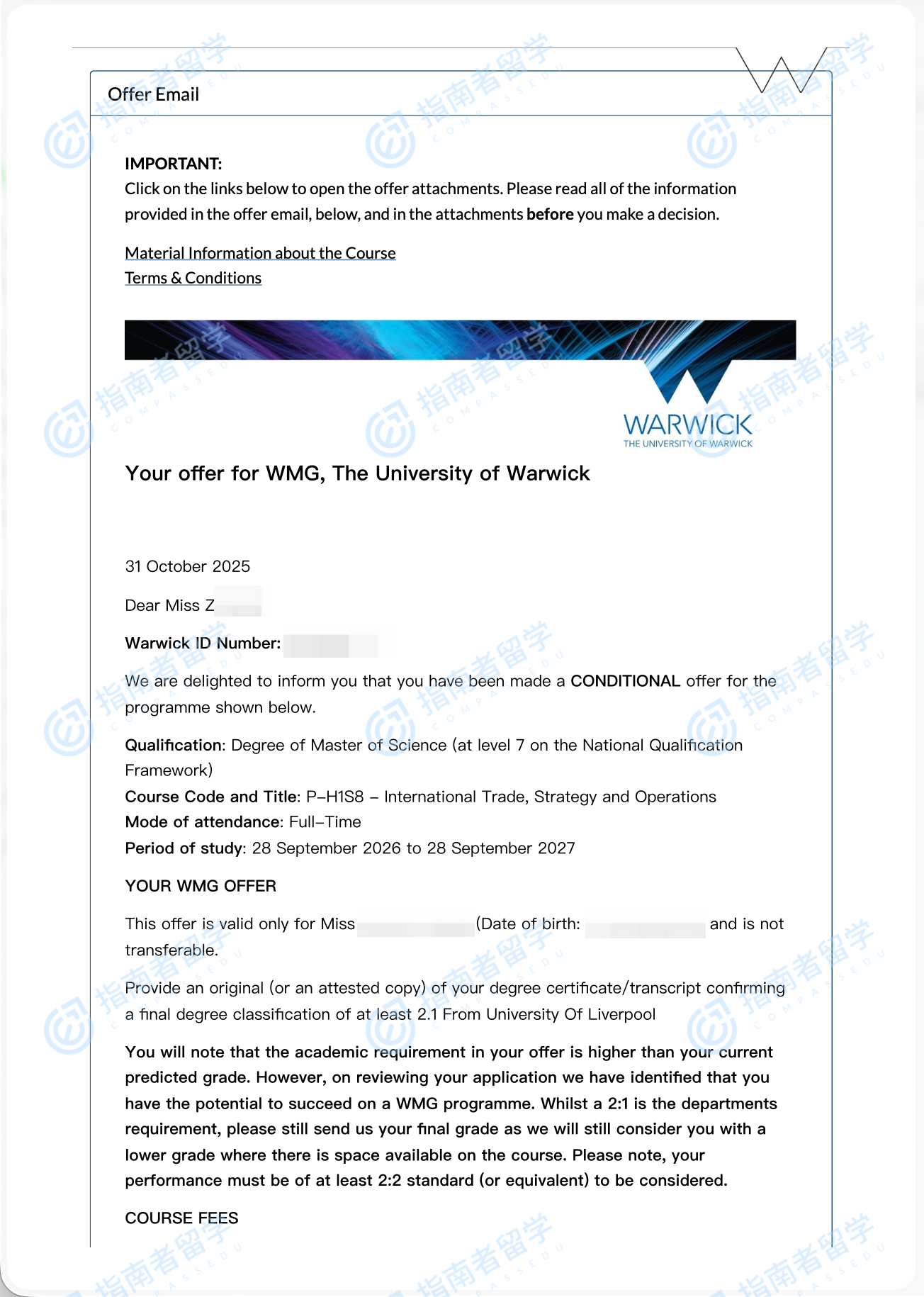 华威大学国际贸易、策略与运营理学硕士研究生offer一枚