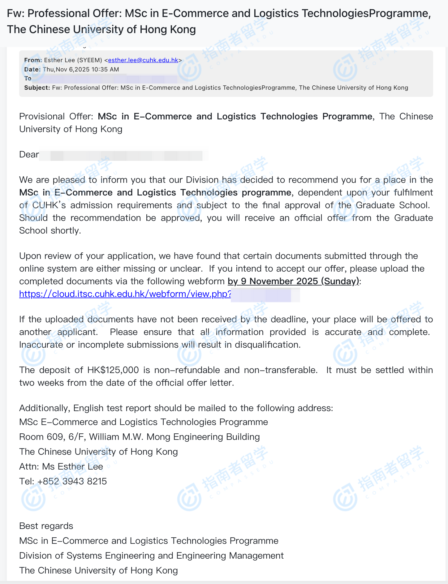 香港中文大学电子商务与物流技术理学硕士研究生offer一枚