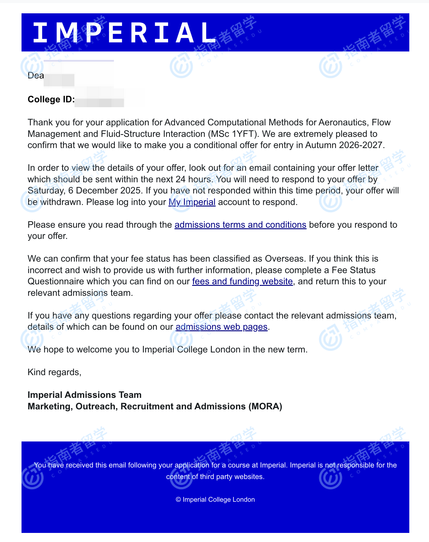帝国理工学院航空学、流量管理与流体结构相互作用高级计算方法理学硕士研究生offer一枚