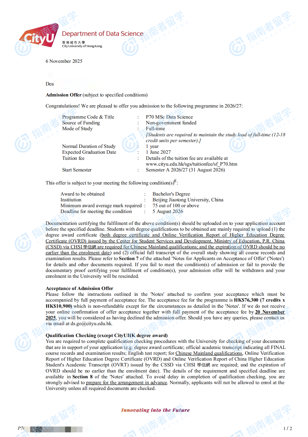 香港城市大学数据科学理学硕士研究生offer一枚