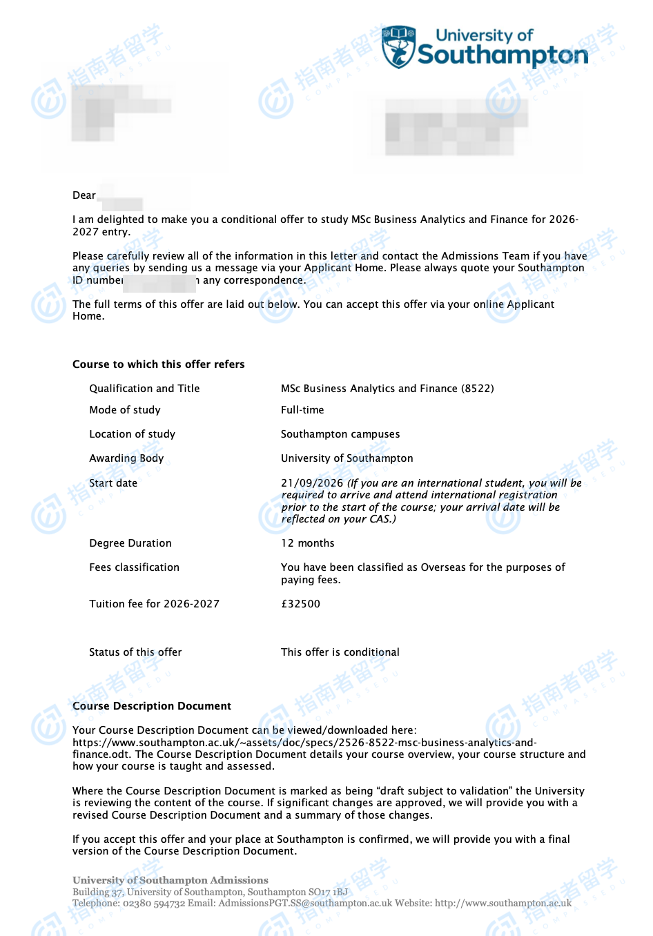 南安普顿大学商业分析与金融理学硕士研究生offer一枚