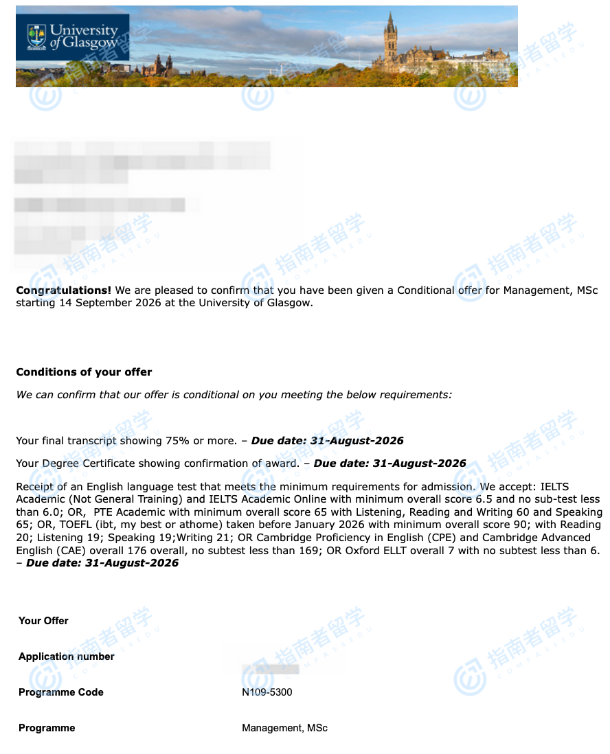 格拉斯哥大学管理学理学硕士研究生offer一枚
