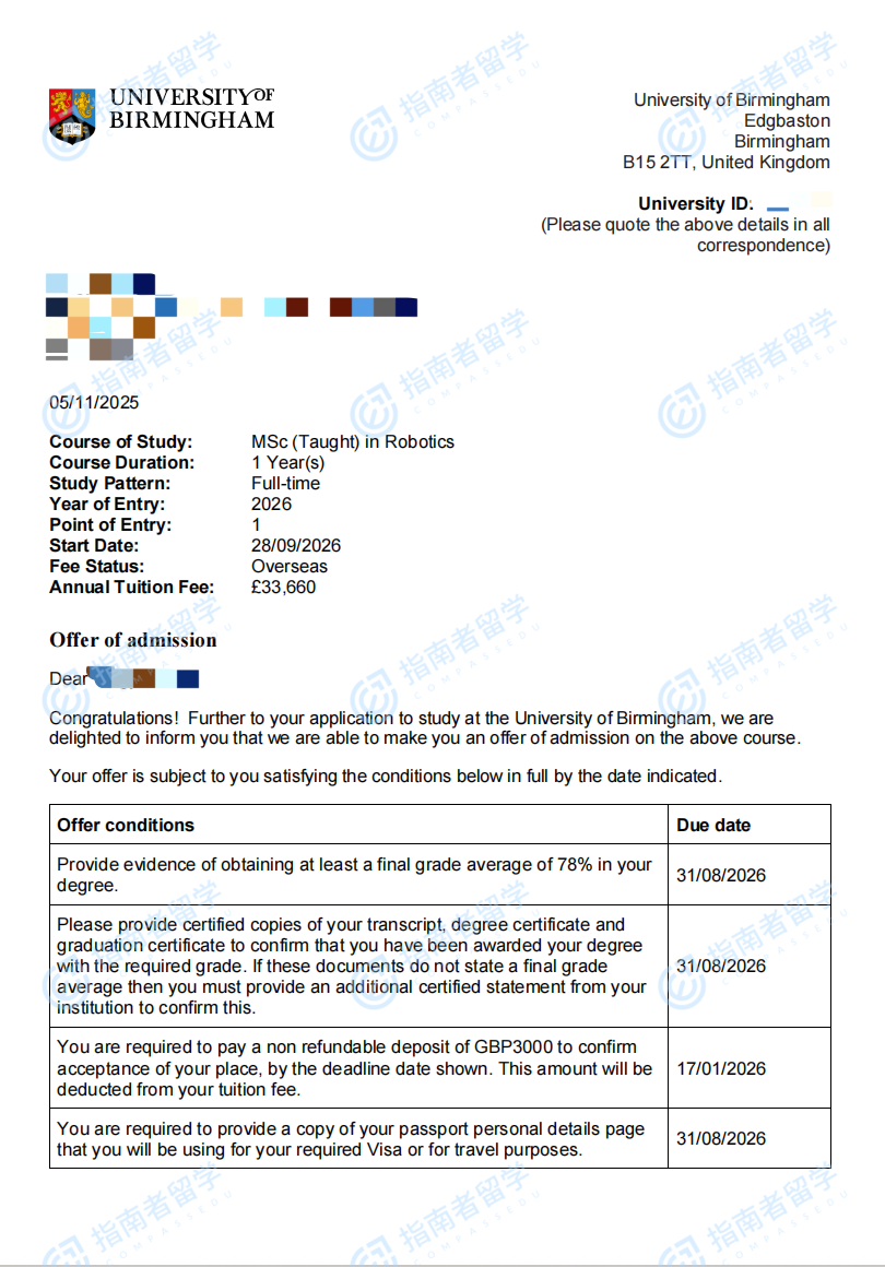 伯明翰大学机器人学理学硕士研究生offer一枚