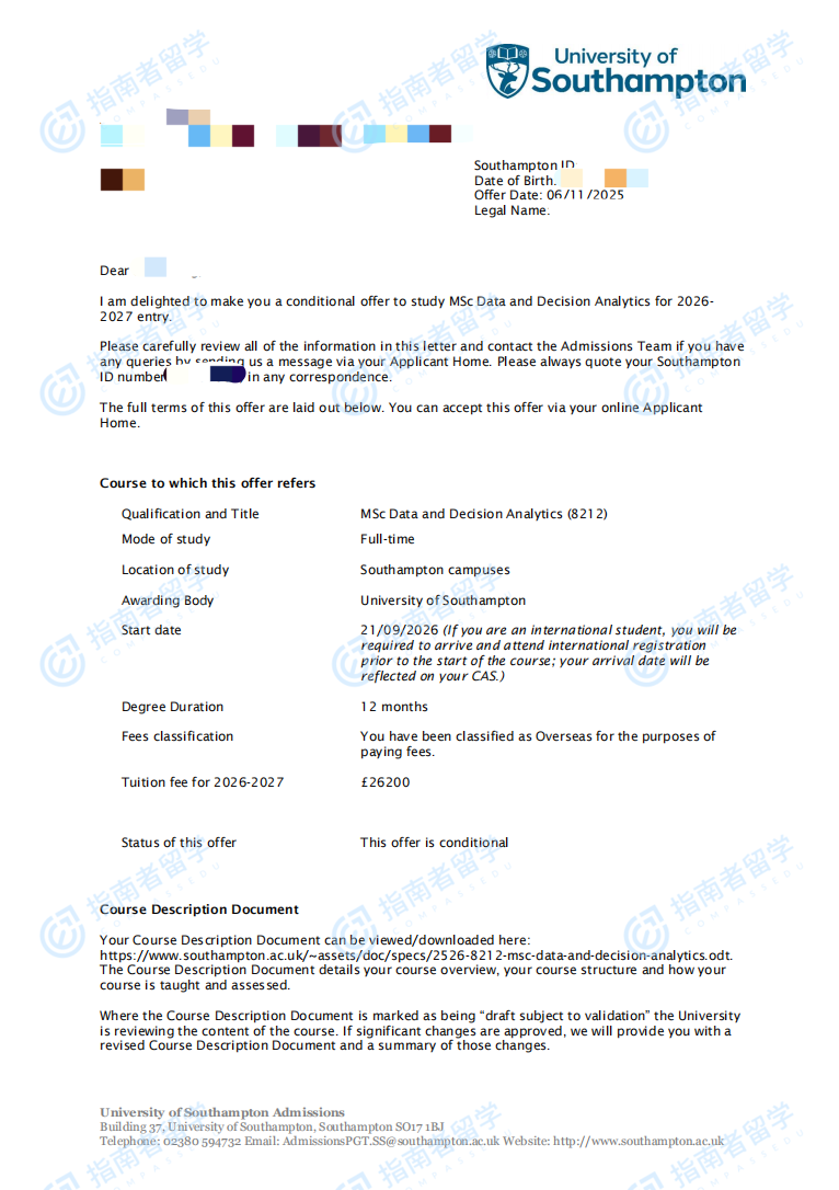 南安普顿大学数据与决策分析理学硕士研究生offer一枚
