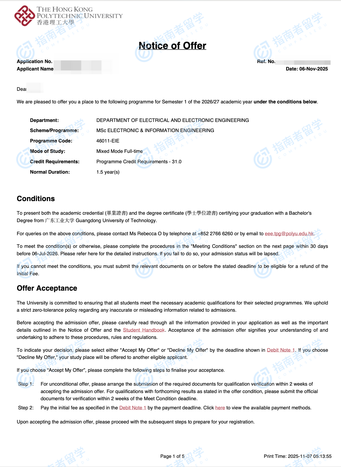 香港理工大学电子及资讯工程学理学硕士研究生offer一枚