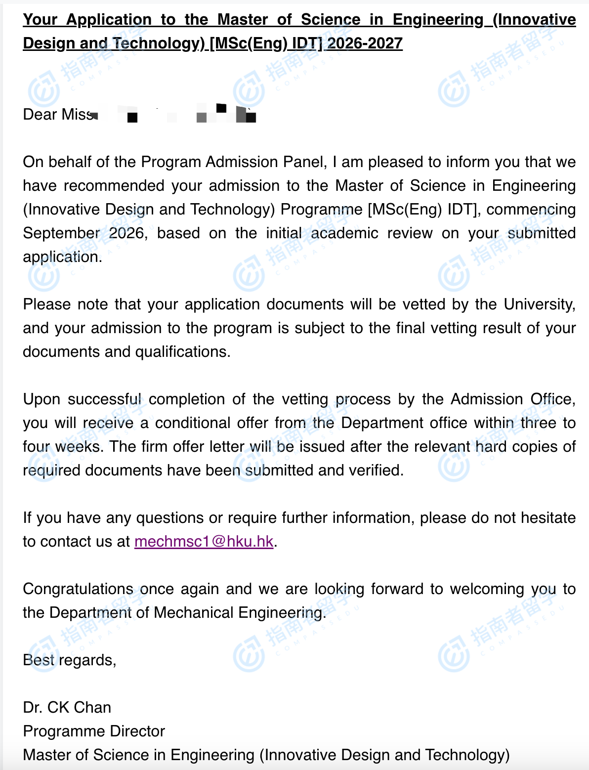 香港大学创新设计与科技(工程)理学硕士研究生offer一枚