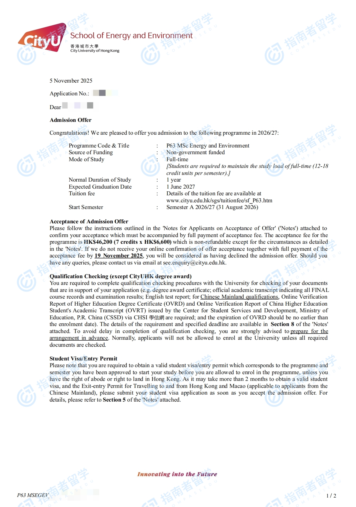 香港城市大学能源及环境理学硕士研究生offer一枚