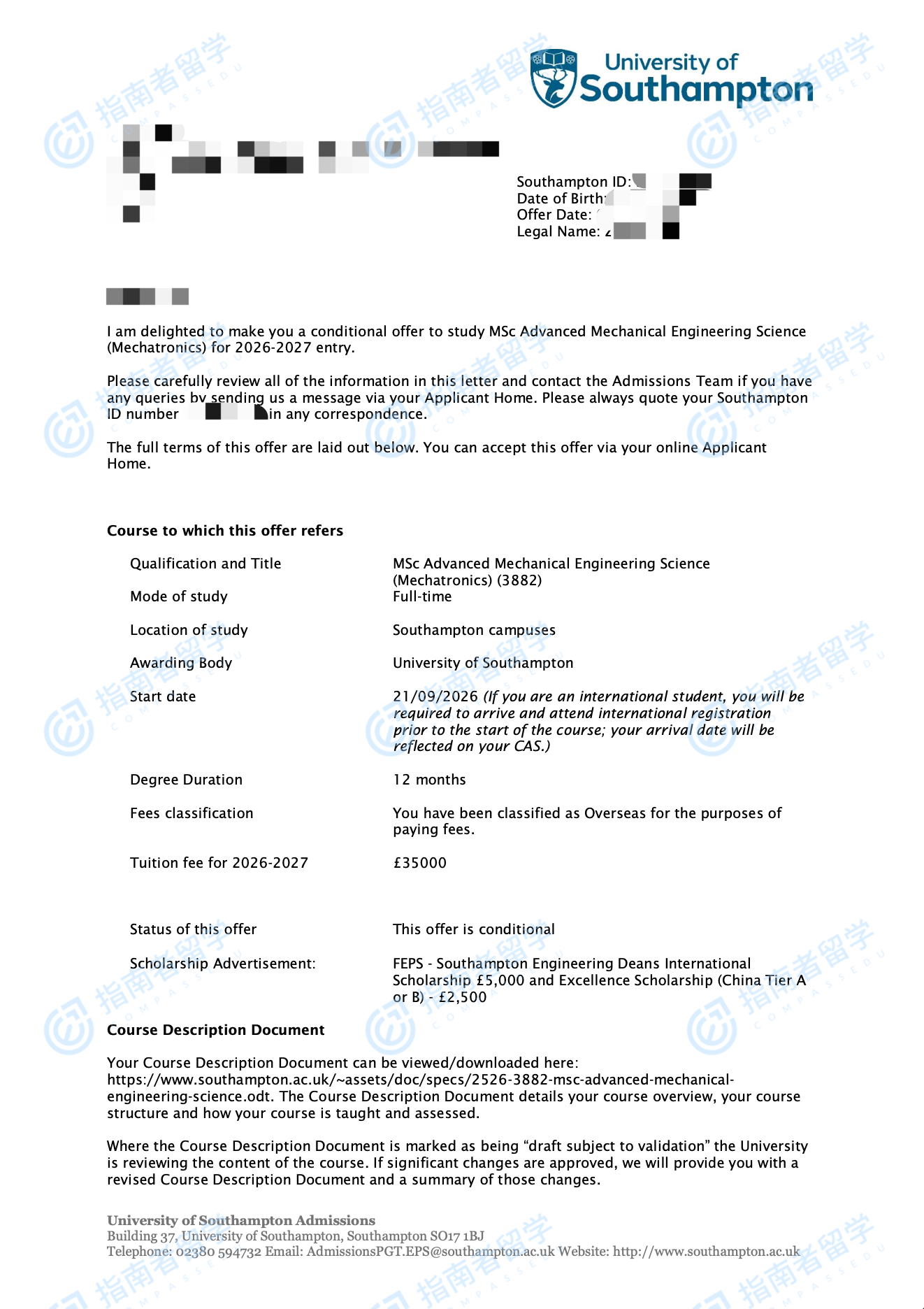 南安普顿大学机械电子学(高级机械工程科学)理学硕士研究生offer一枚