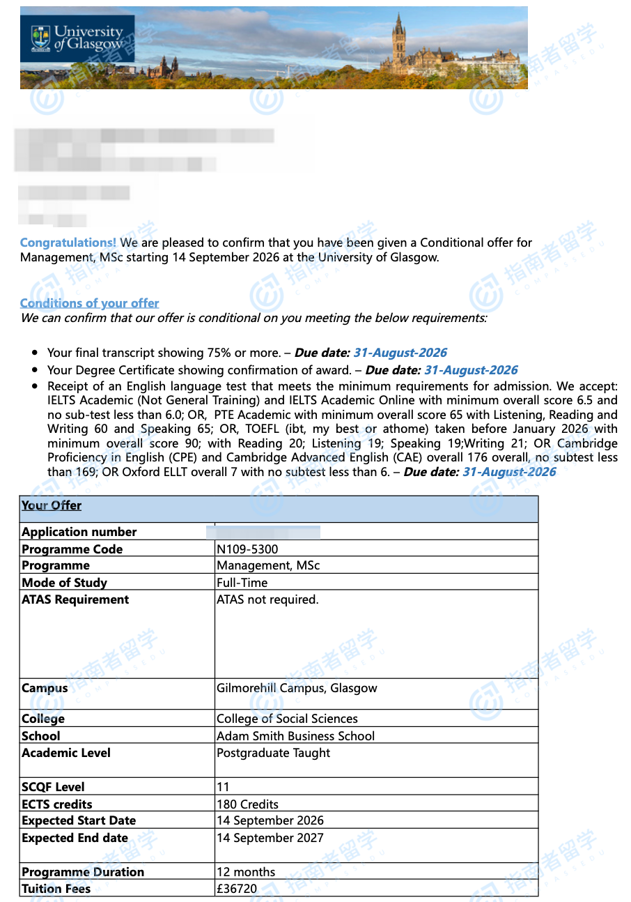格拉斯哥大学管理学理学硕士研究生offer一枚