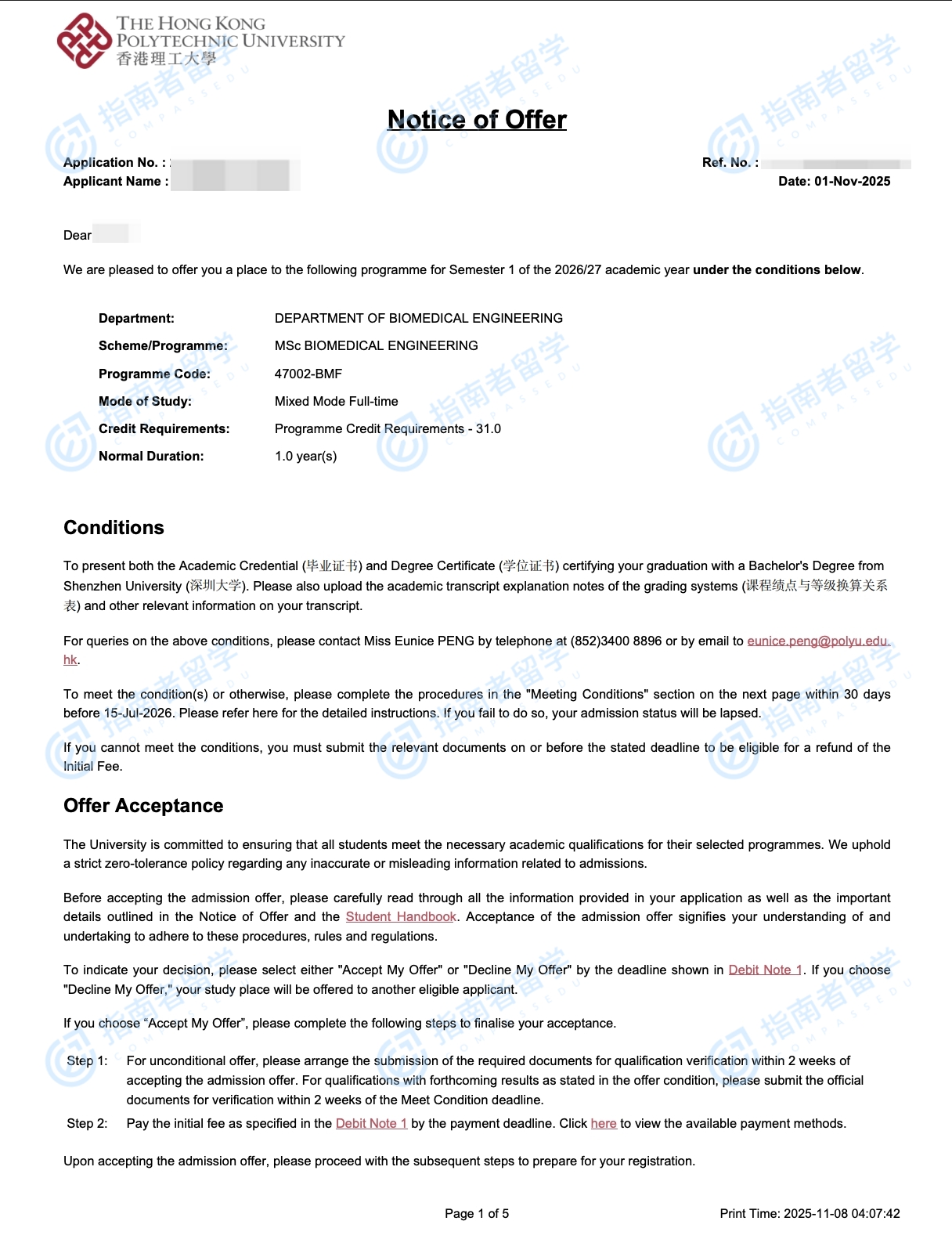 香港理工大学生物医学工程理学硕士研究生offer一枚