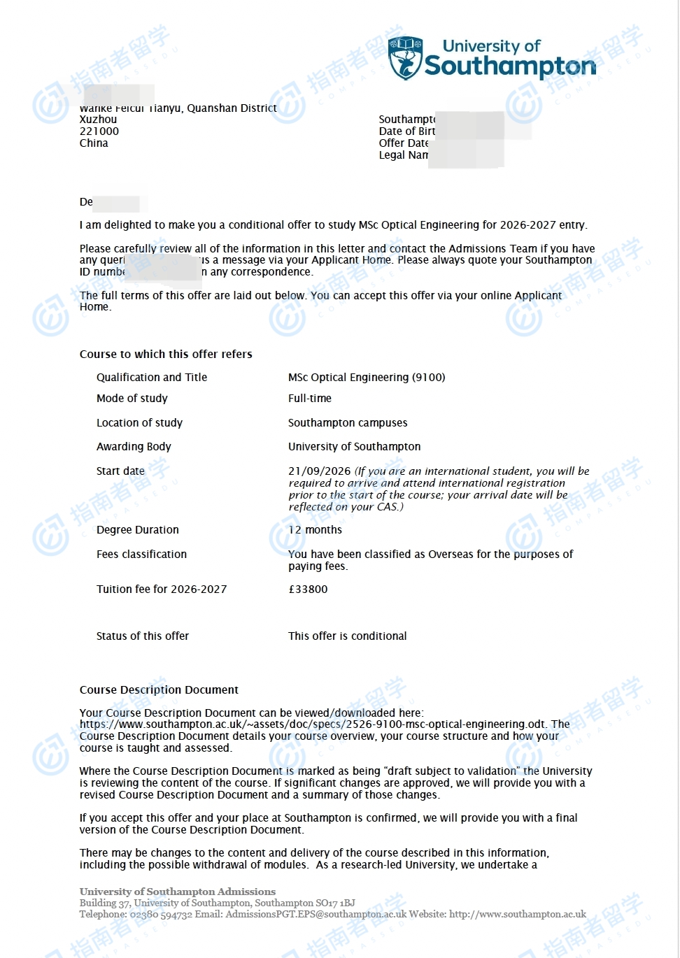 南安普顿大学光学工程理学硕士研究生offer一枚