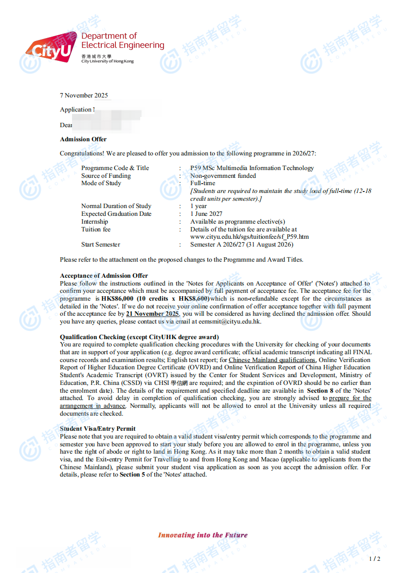 香港城市大学电子计算机与资讯工程理学硕士研究生offer一枚