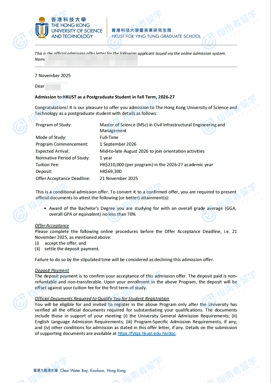 香港科技大学土木基建工程与管理理学硕士研究生offer一枚