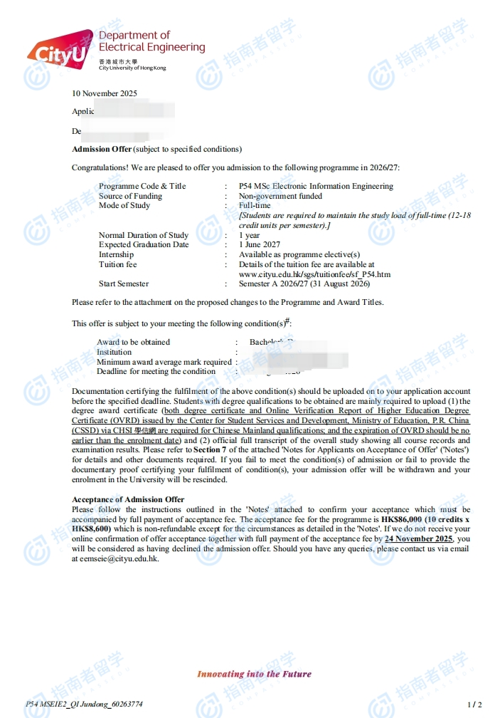 香港城市大学电子资讯工程学理学硕士研究生offer一枚