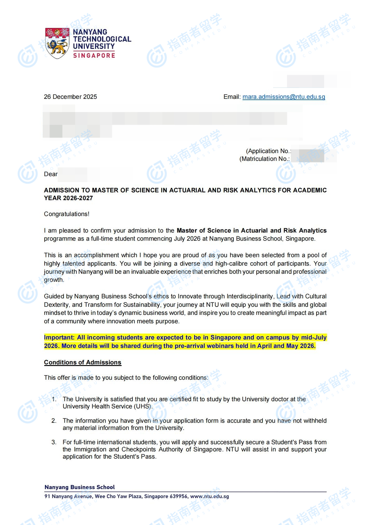 南洋理工大学精算与风险分析理学硕士研究生offer一枚