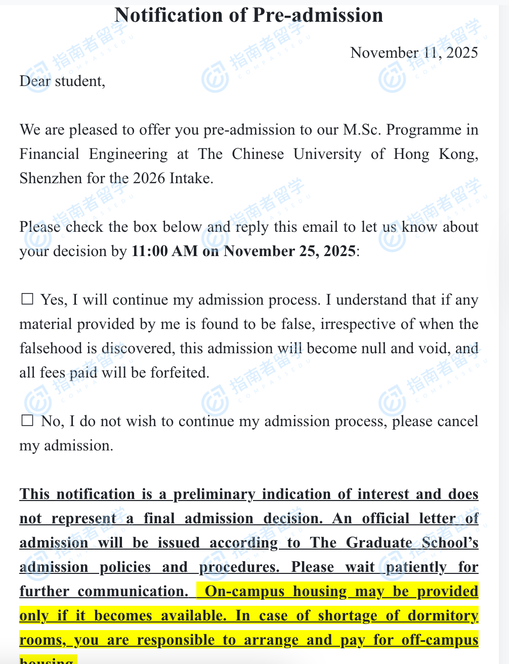 香港中文大学金融工程理学硕士(CUHK-Shenzhen)研究生offer一枚