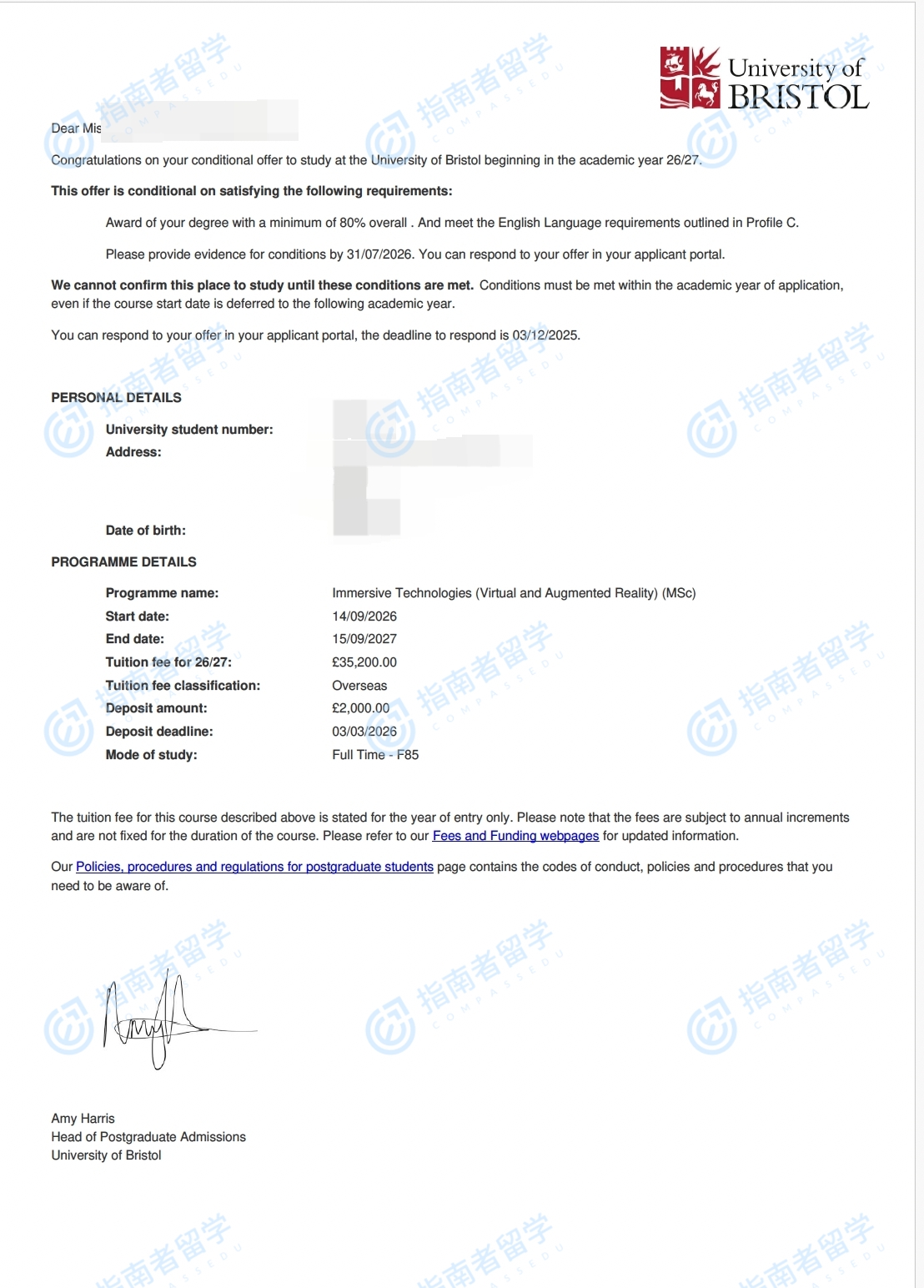 布里斯托大学沉浸式技术(虚拟与增强现实)理学硕士研究生offer一枚