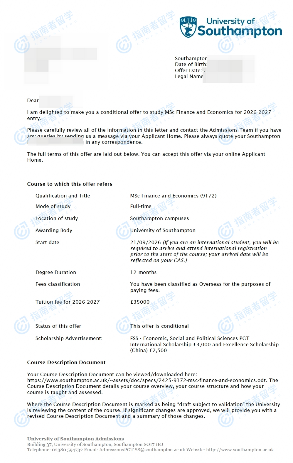 南安普顿大学金融与经济理学硕士研究生offer一枚