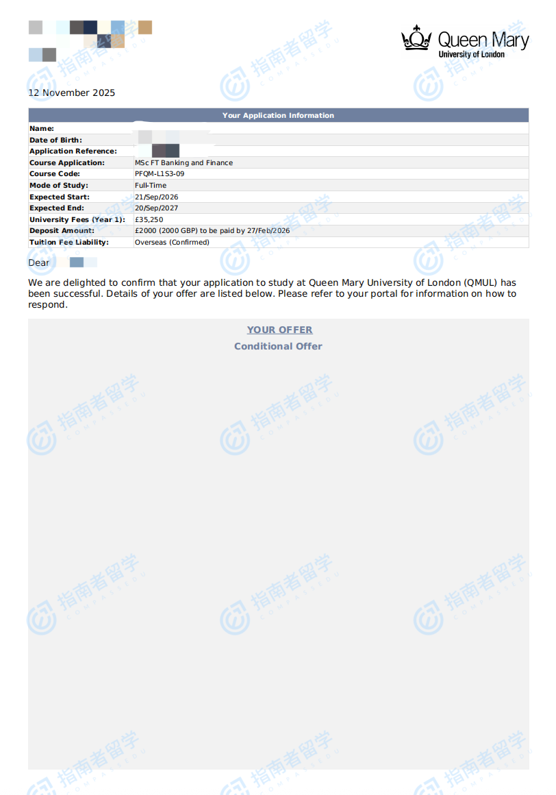 伦敦大学玛丽皇后学院银行与金融理学硕士研究生offer一枚