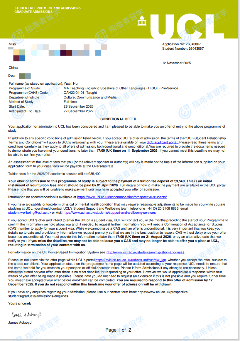 伦敦大学学院对外英语教学文学硕士(面向无教学经验的申请者)研究生offer一枚