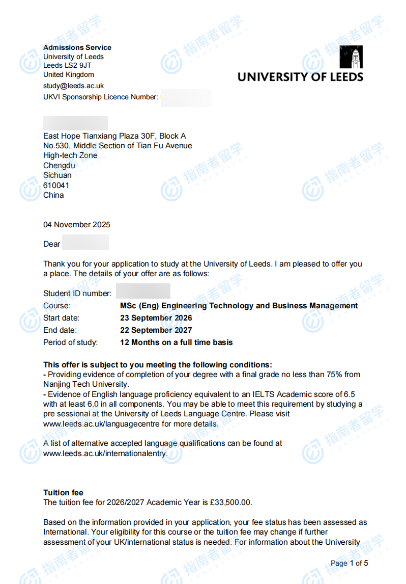 利兹大学工程、技术与商业管理(工程)理学硕士研究生offer一枚