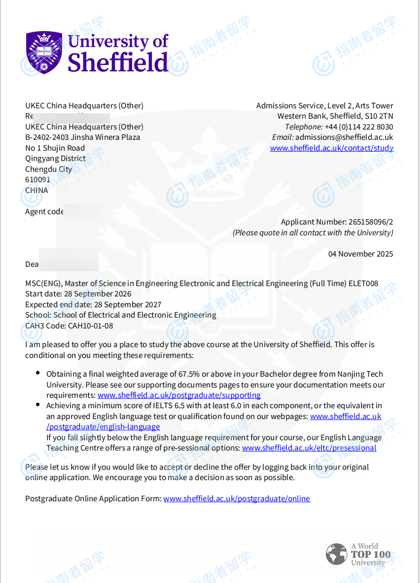 谢菲尔德大学电子与电气工程(工程)理学硕士研究生offer一枚