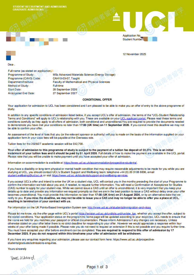 伦敦大学学院高级材料科学(能源存储)理学硕士研究生offer一枚