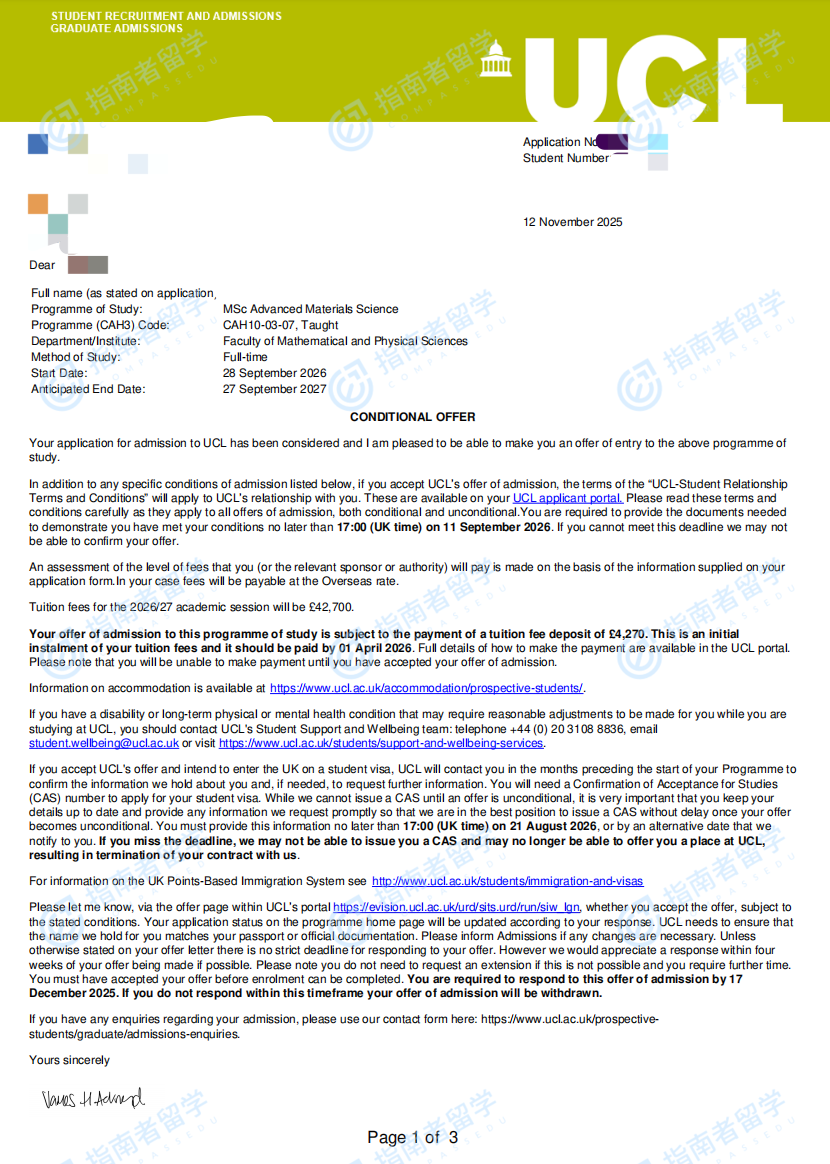 伦敦大学学院高级材料科学理学硕士研究生offer一枚
