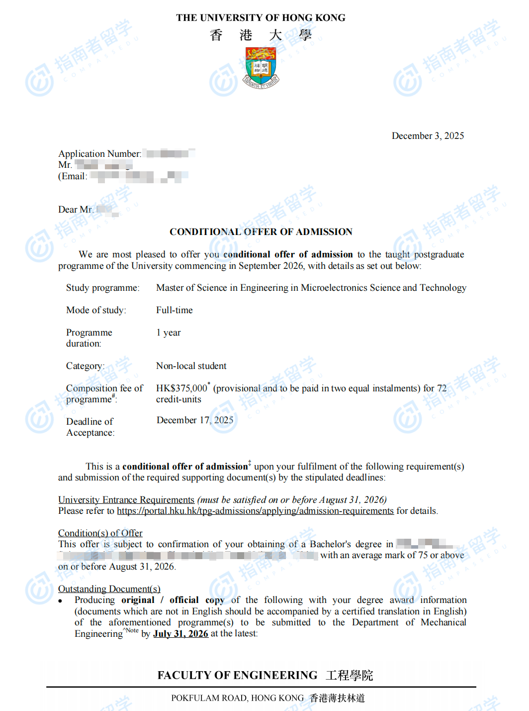 香港大学微电子科学与技术(工程)理学硕士研究生offer一枚