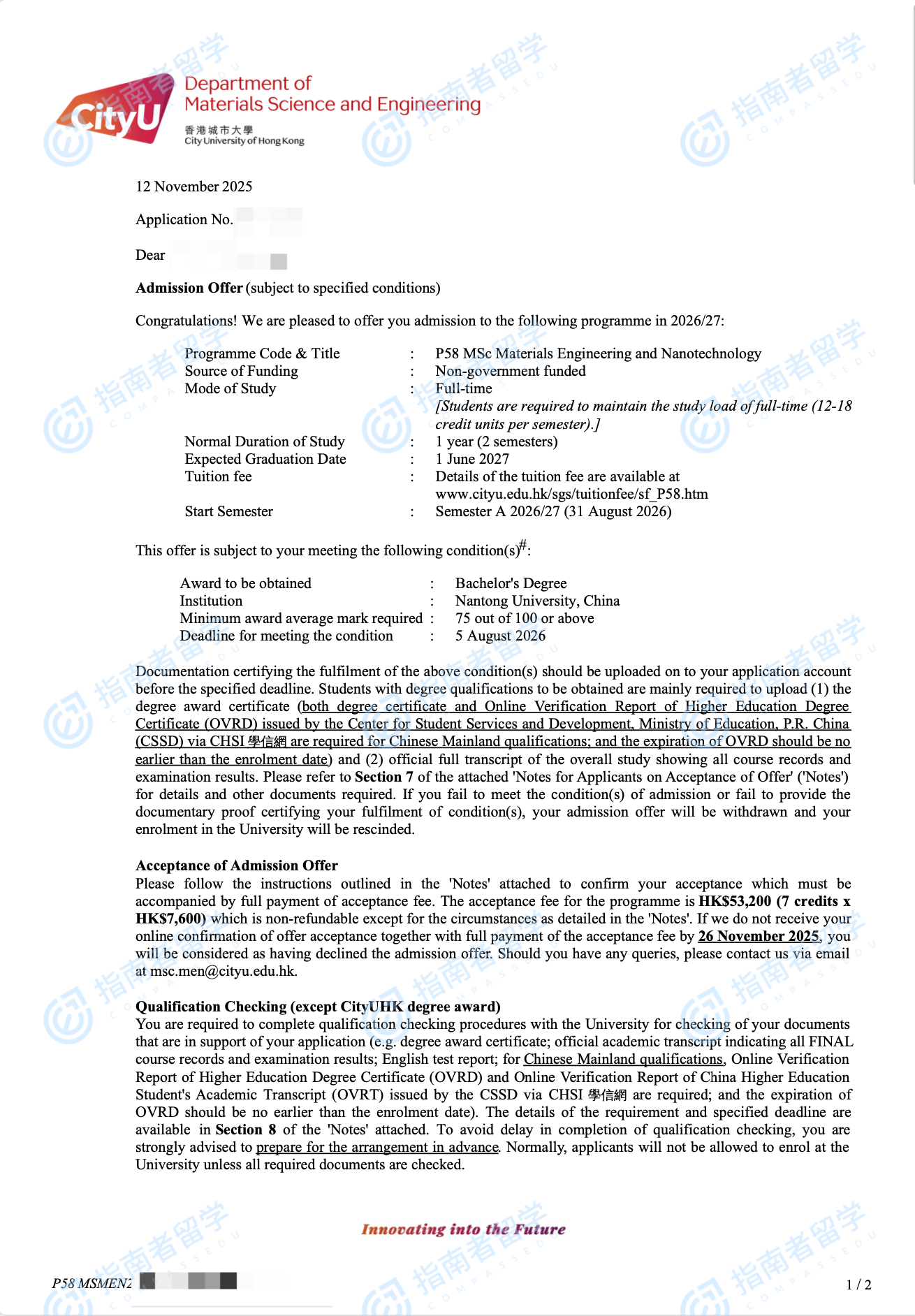 香港城市大学材料工程与纳米技术理学硕士研究生offer一枚