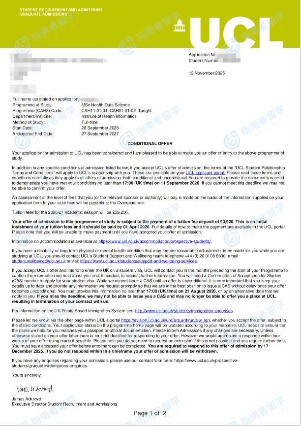 伦敦大学学院健康数据科学理学硕士研究生offer一枚