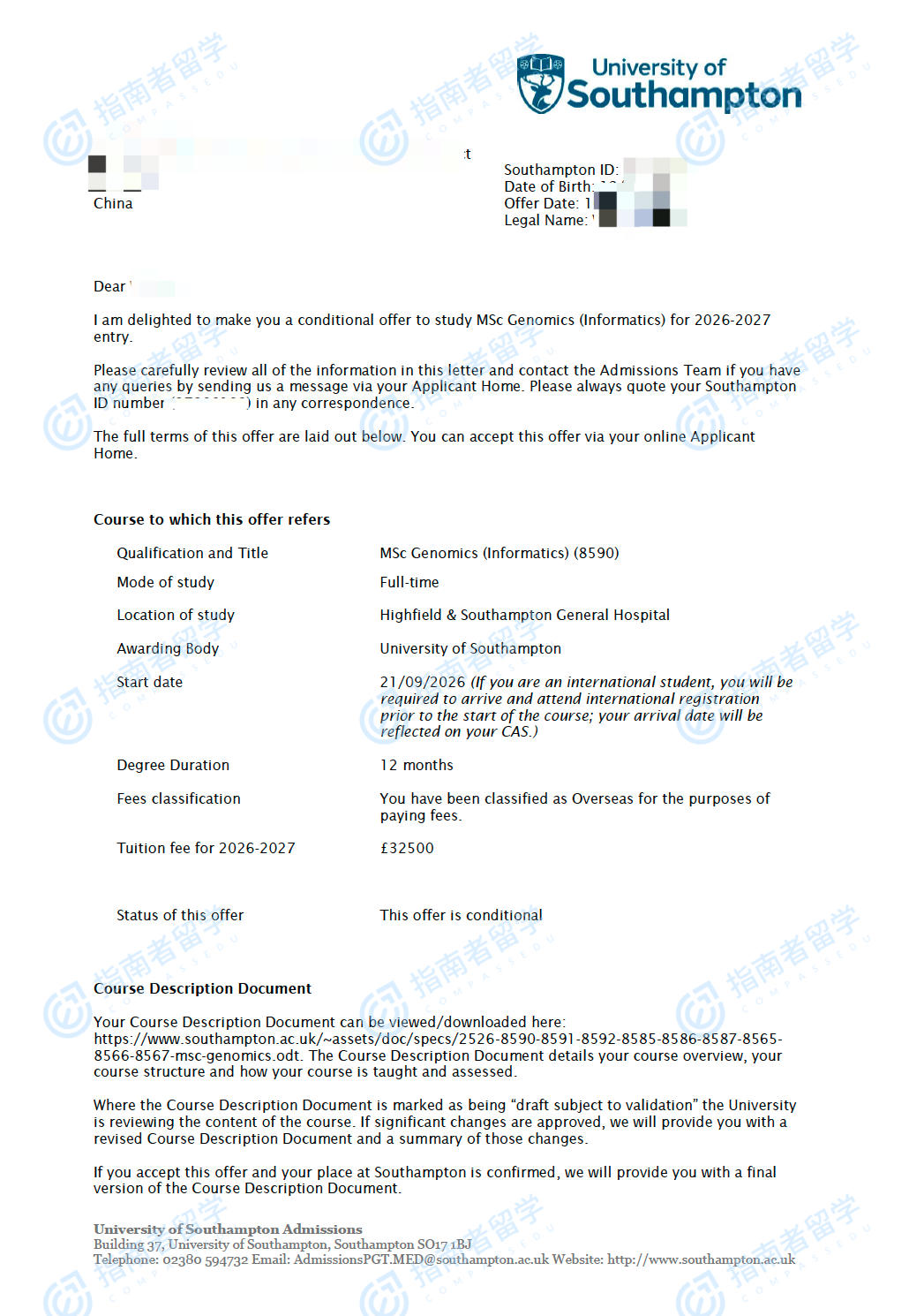 南安普顿大学基因组学理学硕士(信息学)研究生offer一枚
