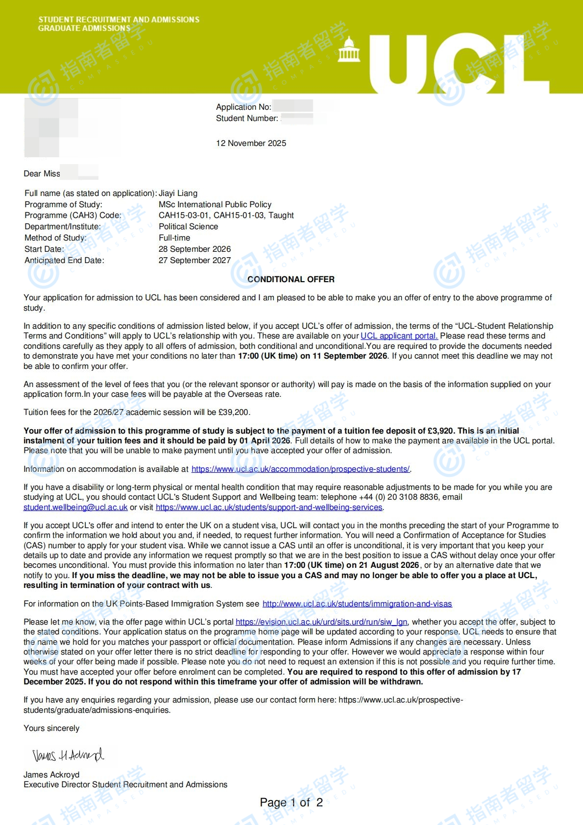 伦敦大学学院国际公共政策理学硕士研究生offer一枚