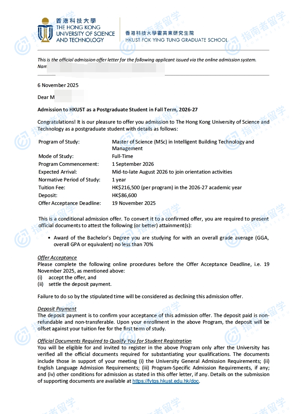 香港科技大学智能建筑物技术与管理理学硕士研究生offer一枚