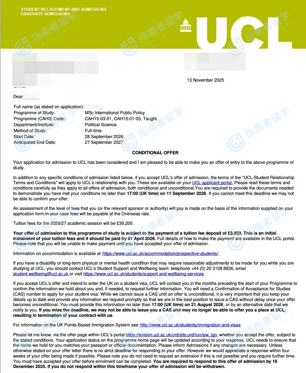 伦敦大学学院国际公共政策理学硕士研究生offer一枚