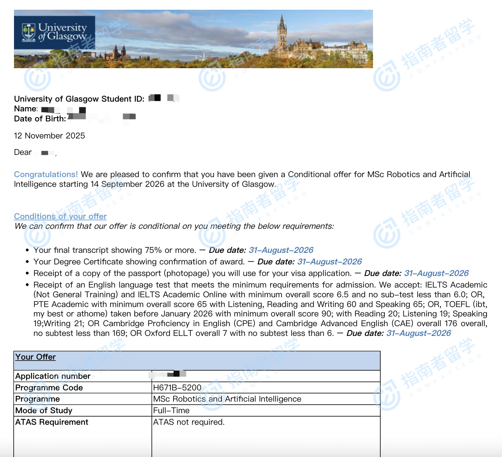 格拉斯哥大学机器人与人工智能理学硕士研究生offer一枚