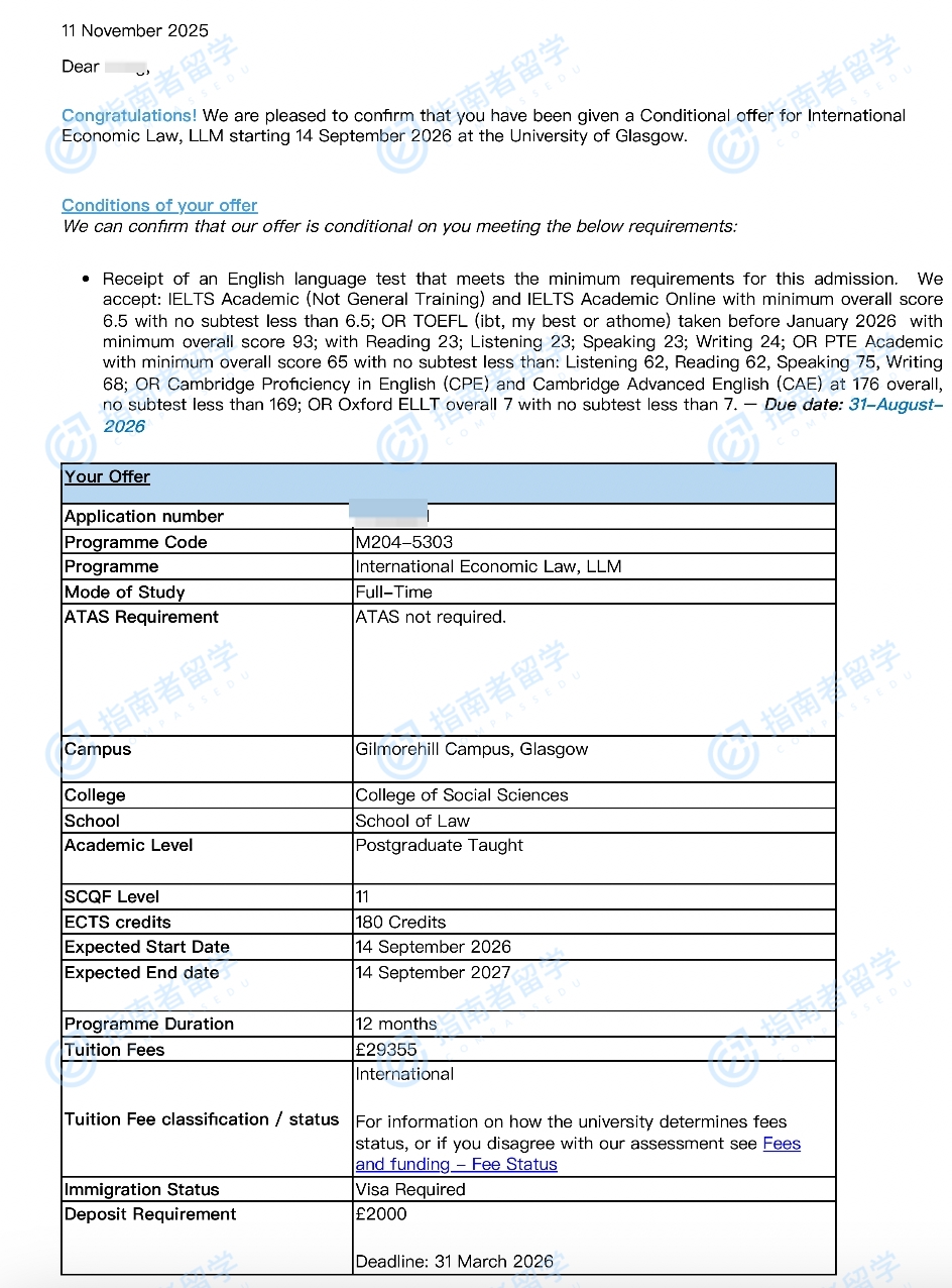 格拉斯哥大学国际经济法法学硕士研究生offer一枚