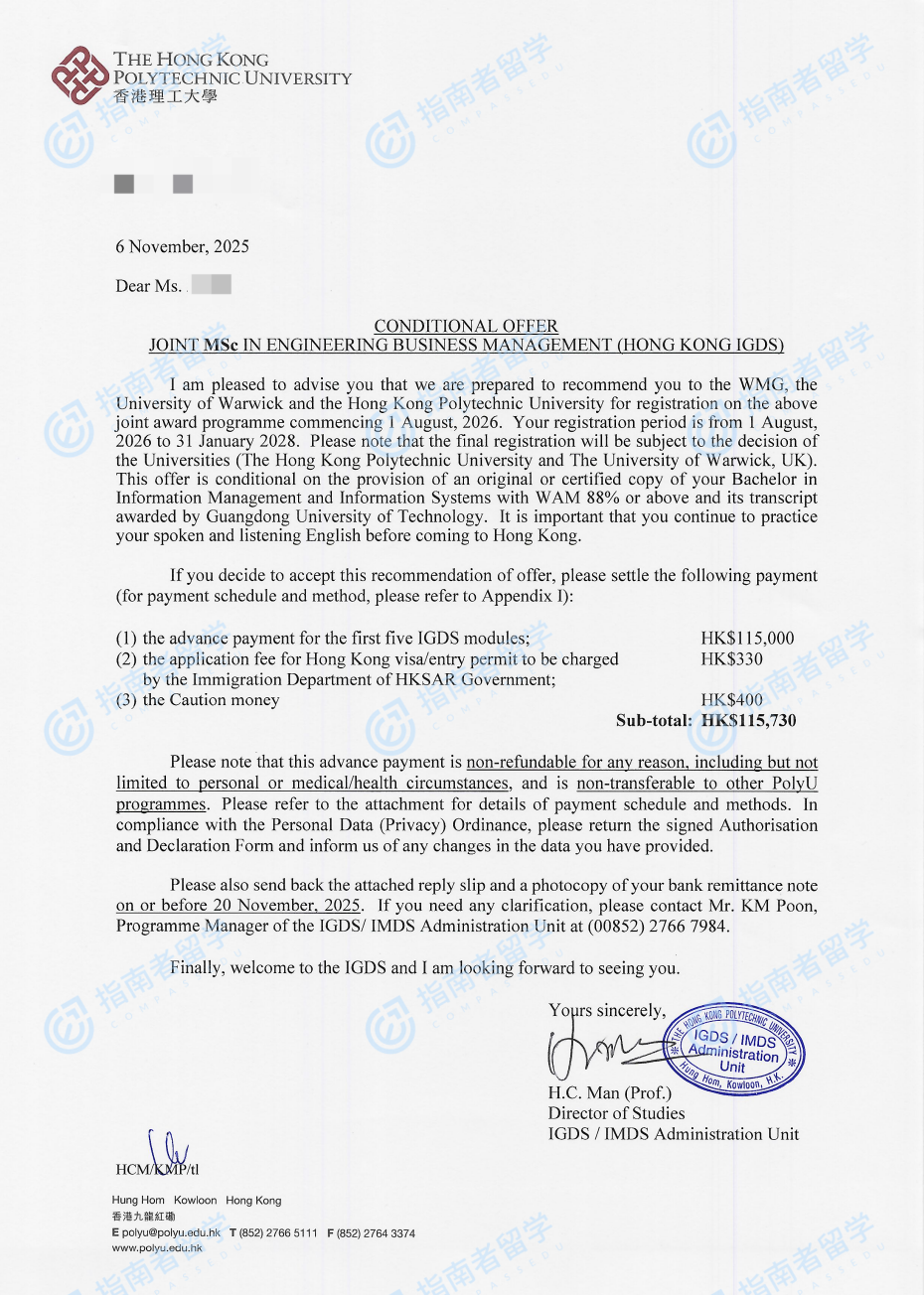 香港理工大学工程商业管理理学硕士研究生offer一枚