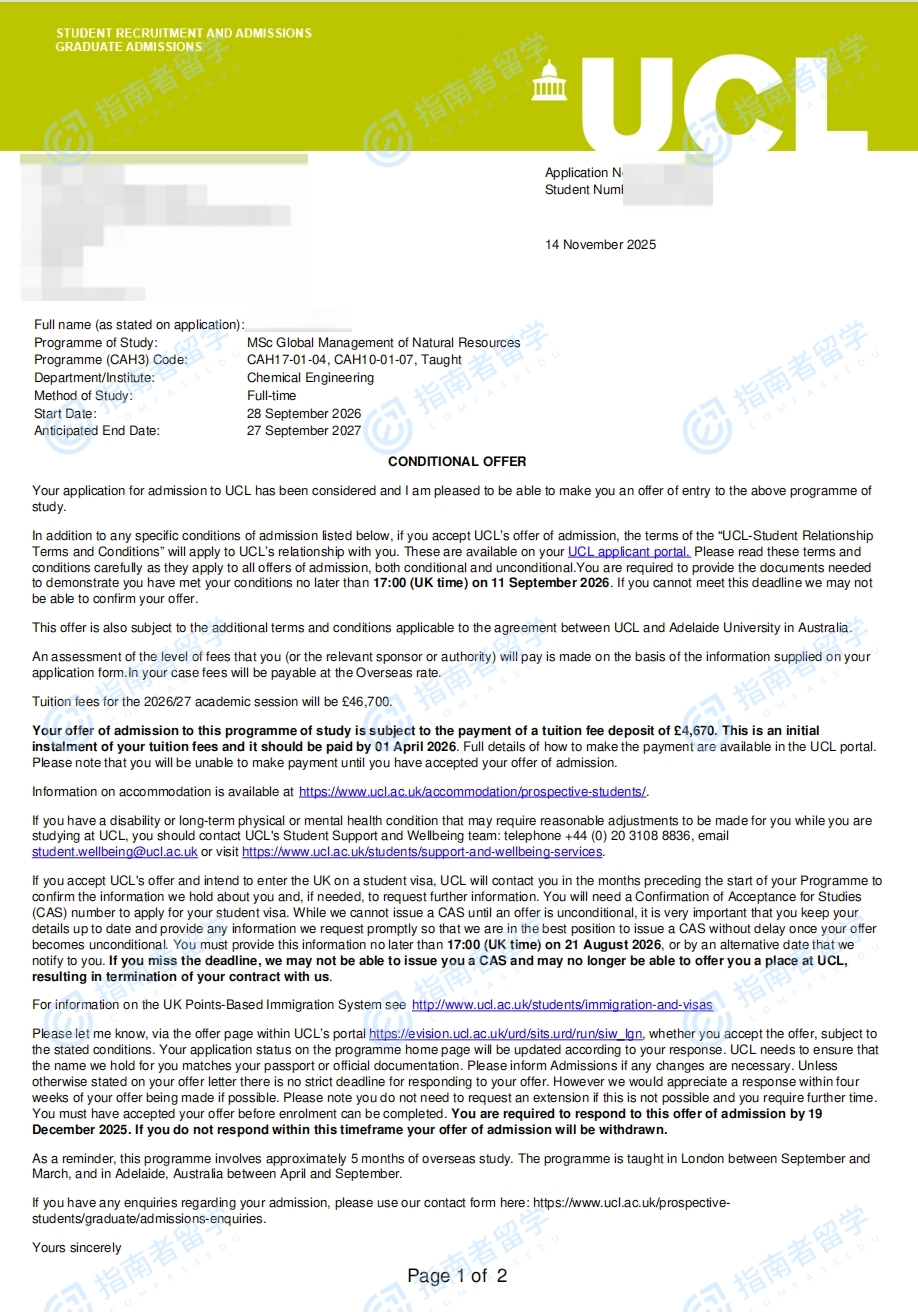 伦敦大学学院自然资源全球管理理学硕士研究生offer一枚