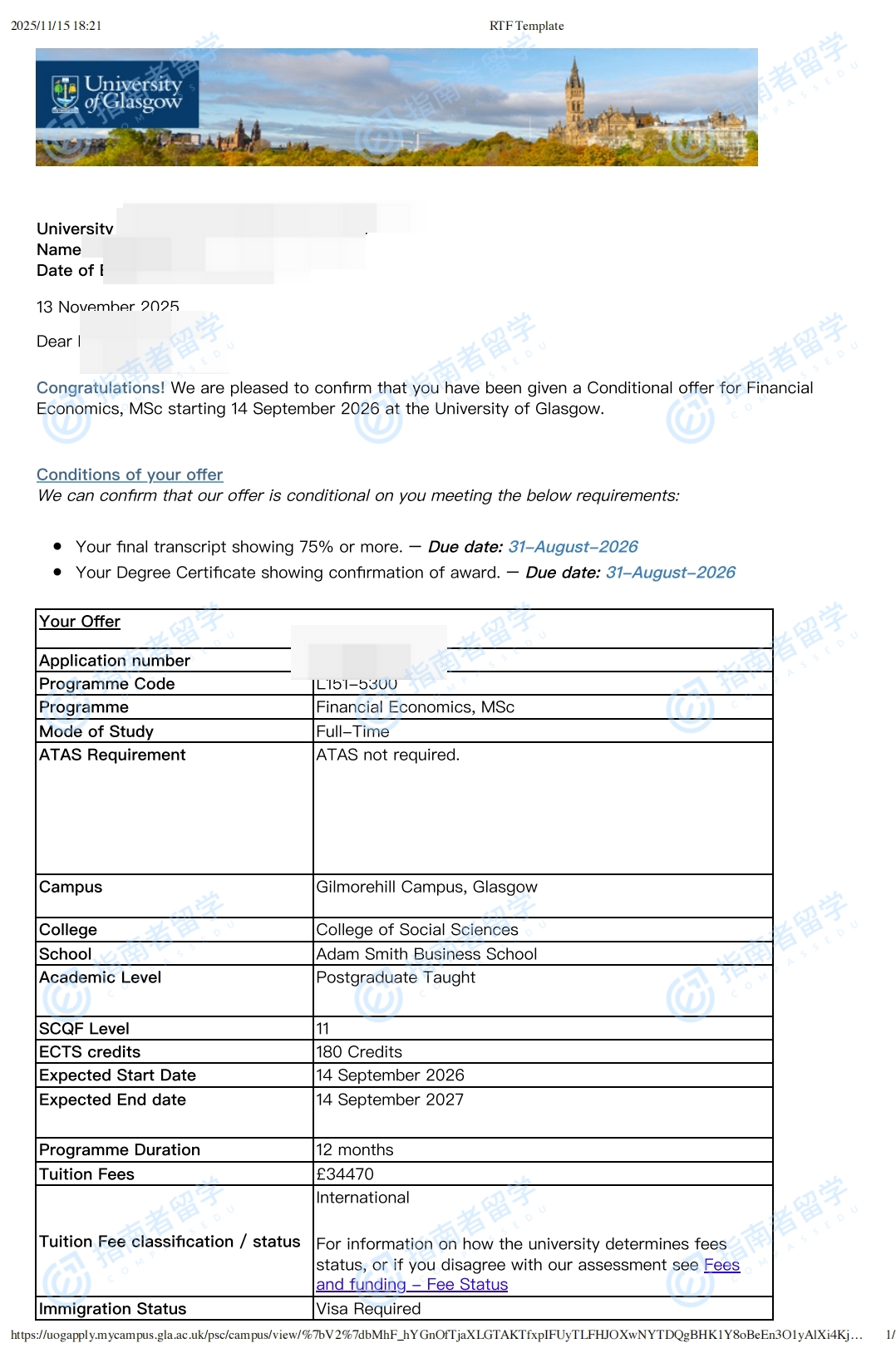 格拉斯哥大学金融经济学理学硕士研究生offer一枚