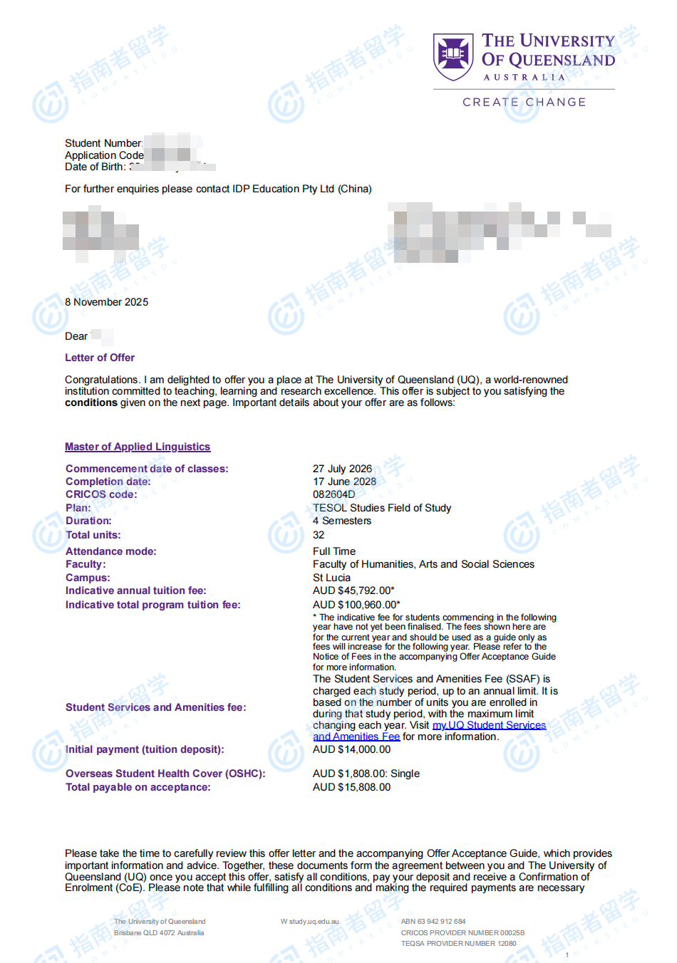 昆士兰大学应用语言学硕士(2年制)研究生offer一枚