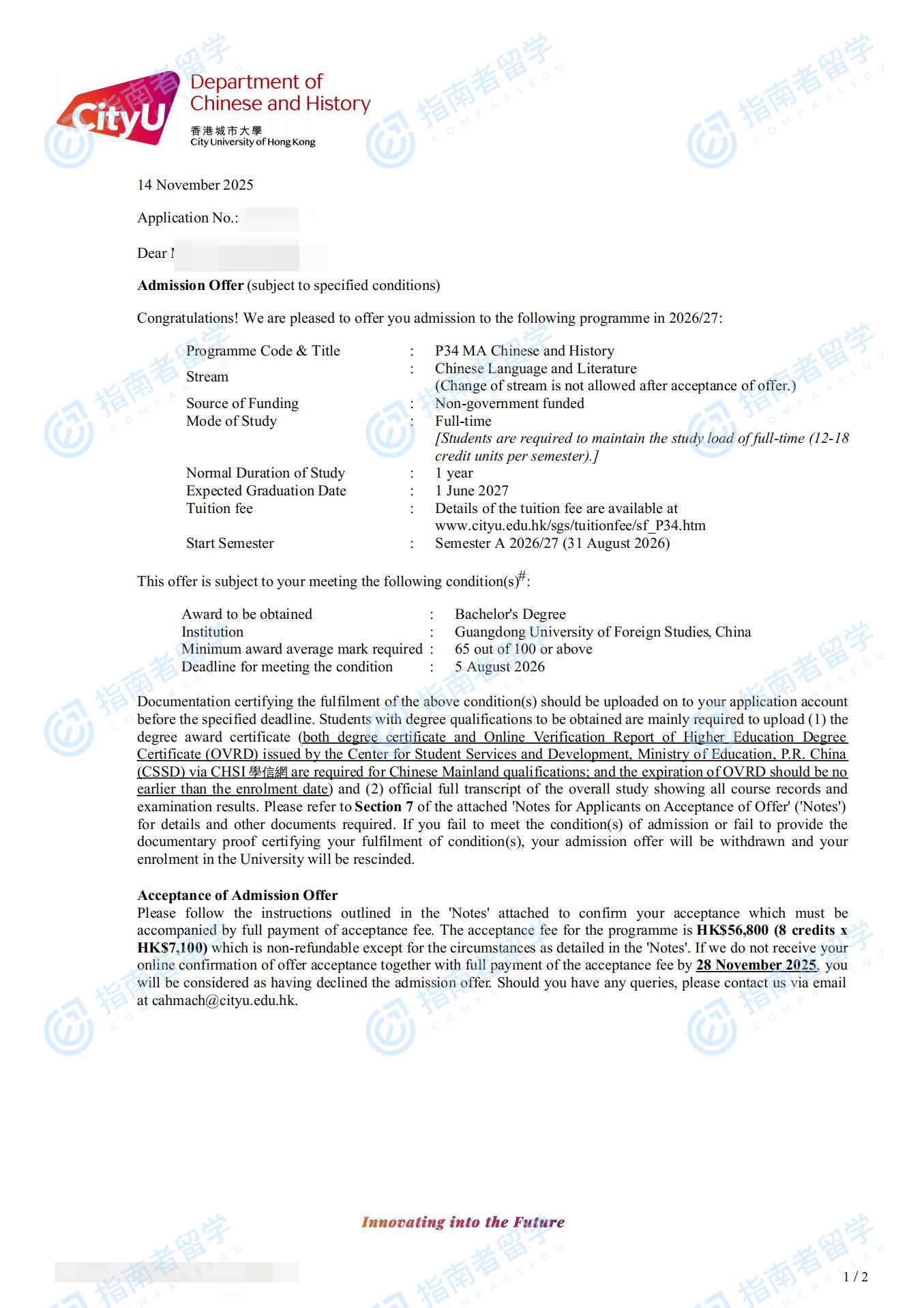 香港城市大学中国语言文学与历史文学硕士研究生offer一枚