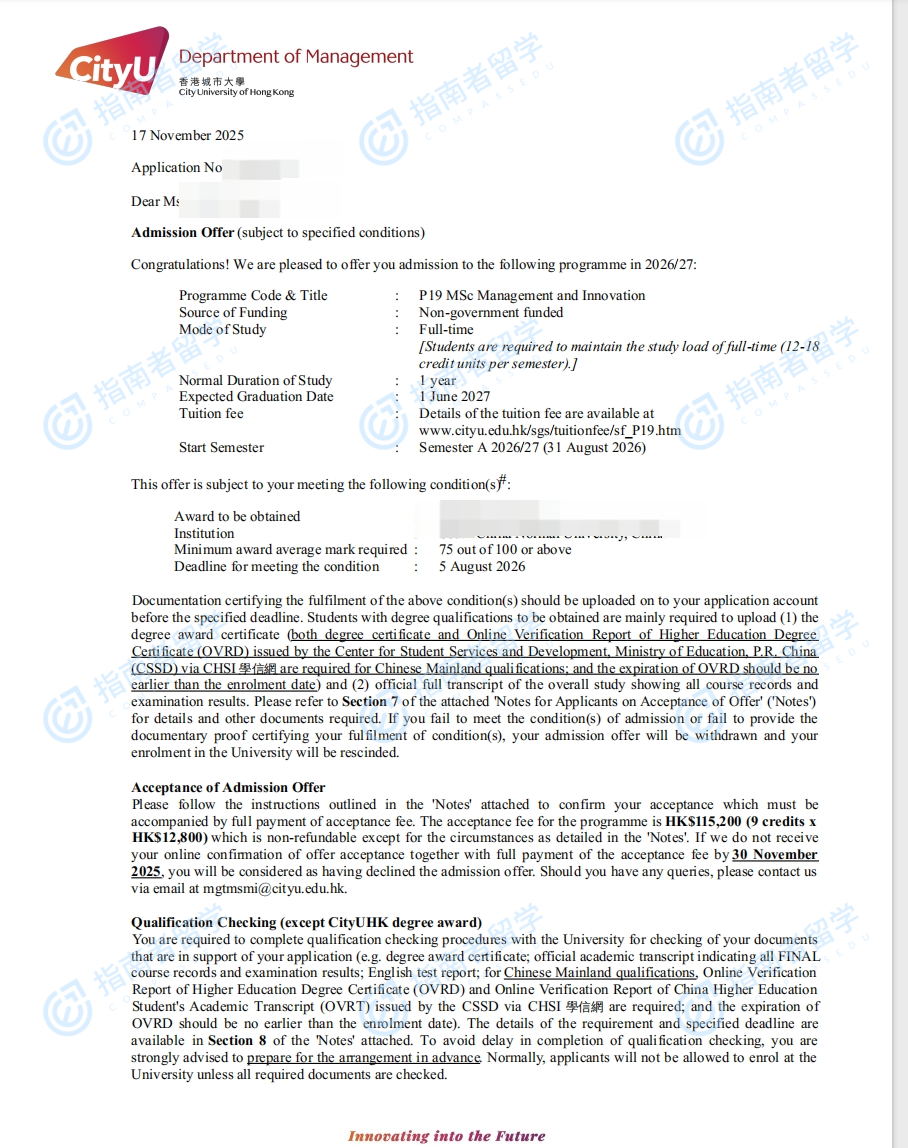 香港城市大学管理与创新理学硕士研究生offer一枚