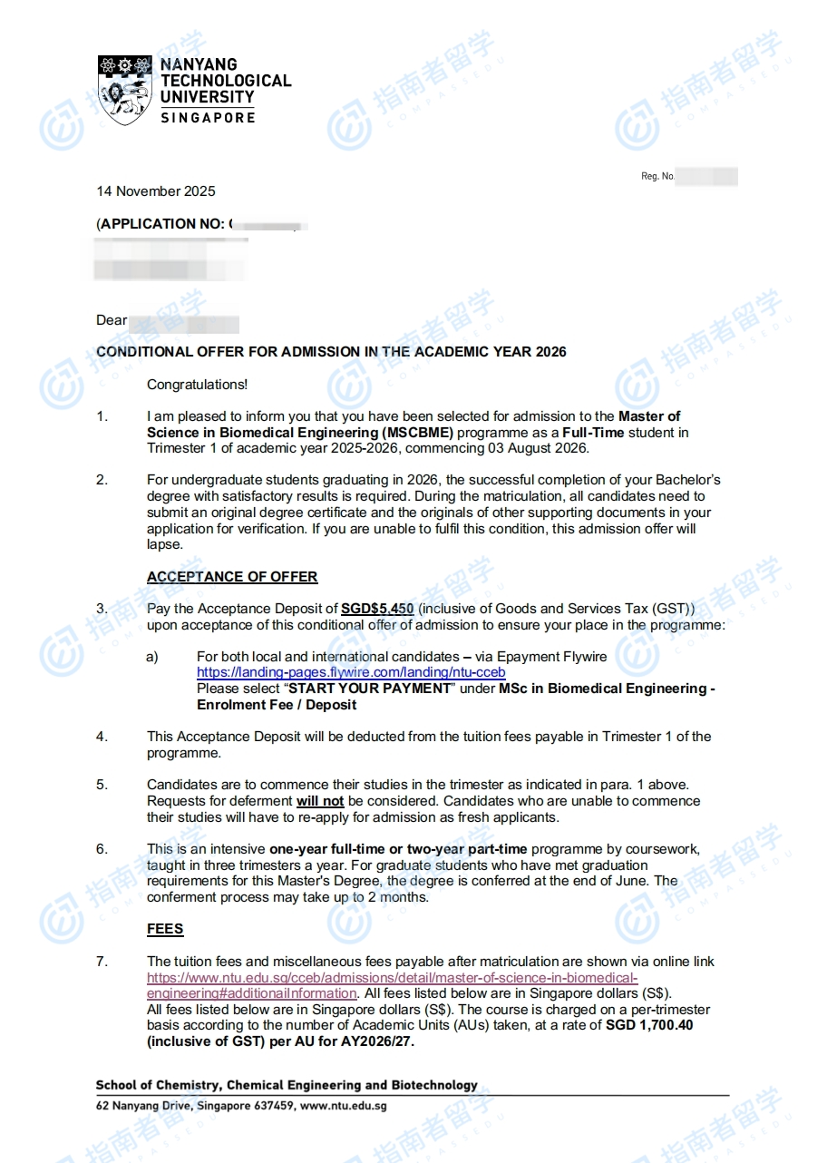 南洋理工大学生物医学工程理学硕士研究生offer一枚