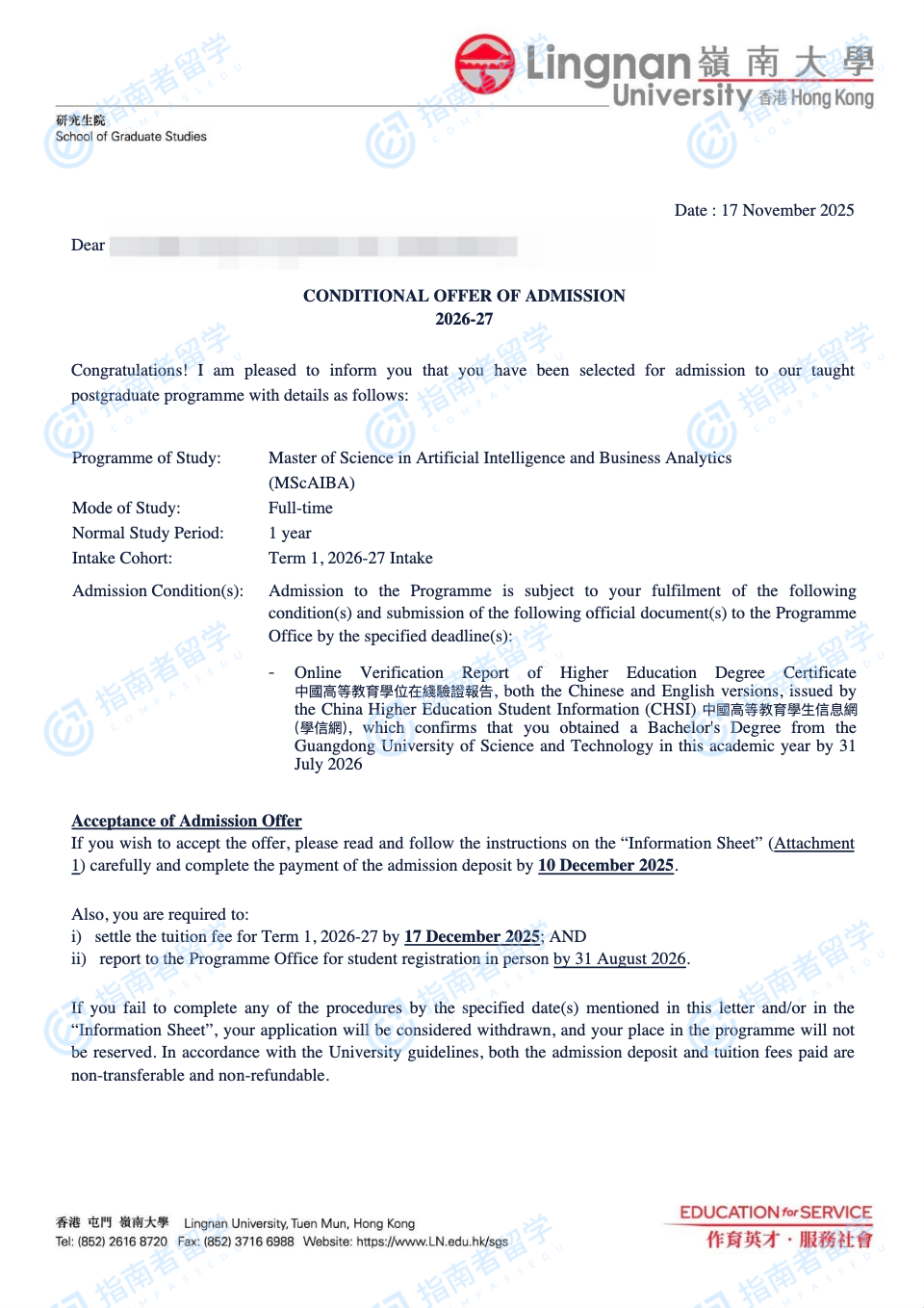 香港岭南大学人工智能与商业分析理学硕士研究生offer一枚