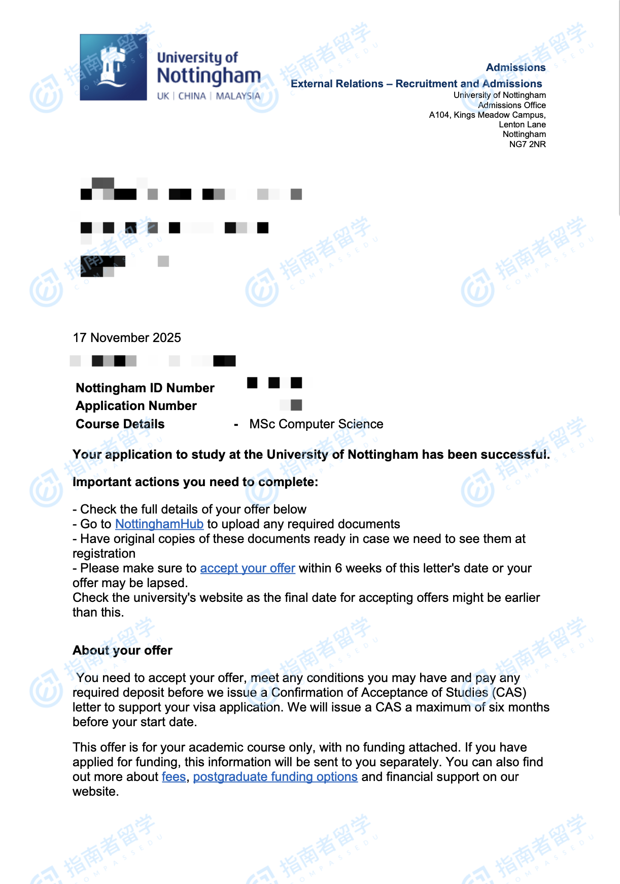 诺丁汉大学计算机科学/计算机科学(人工智能)理学硕士研究生offer一枚