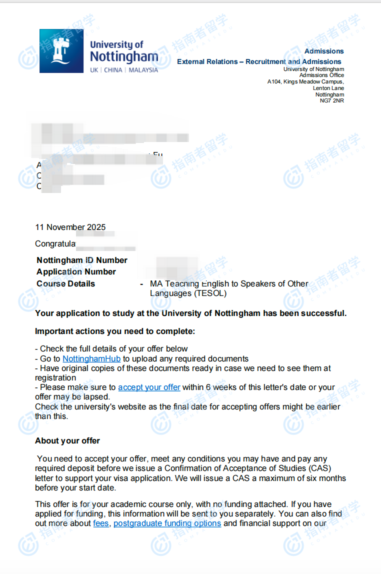诺丁汉大学对外英语教学文学硕士研究生offer一枚