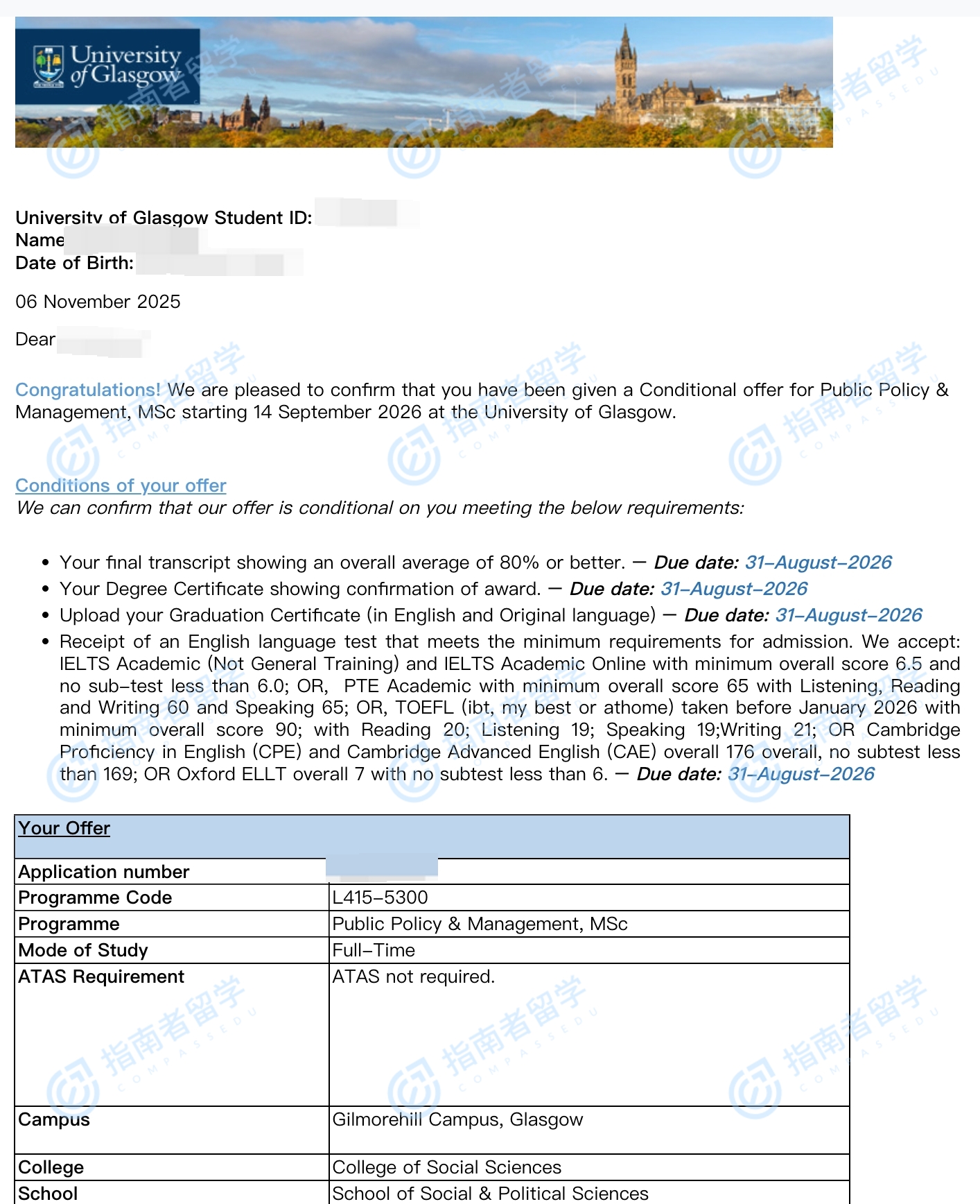 格拉斯哥大学公共政策与管理理学硕士研究生offer一枚