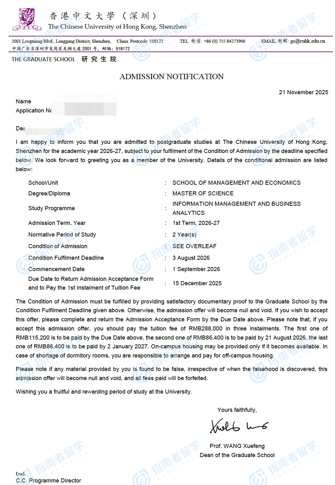 香港中文大学信息管理 & 商业分析理学硕士(CUHK-Shenzhen)研究生offer一枚