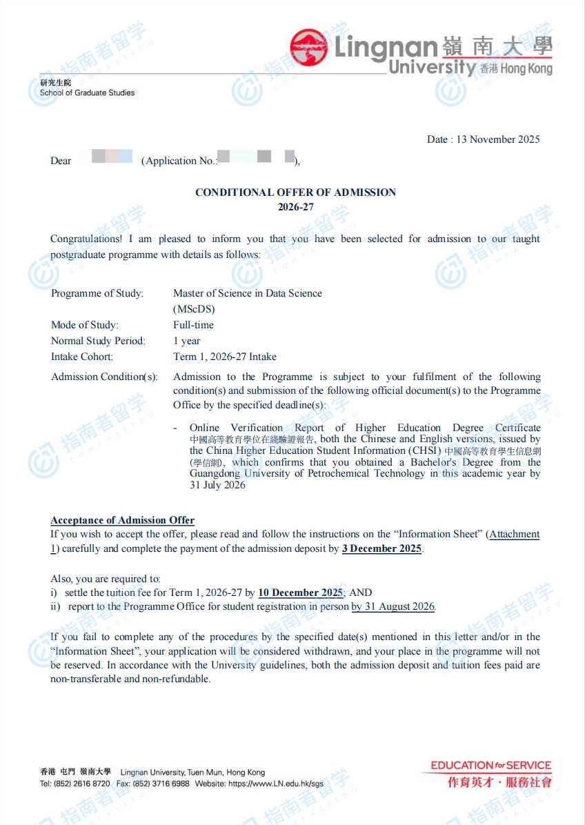 香港岭南大学数据科学理学硕士研究生offer一枚